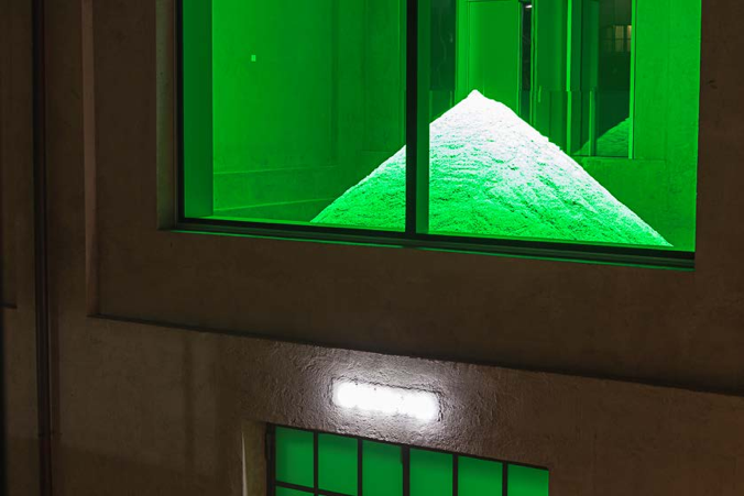 L’installazione della svizzera Rosenkranz è un’enorme montagna di sabbia che occupa interamente una delle ampie sale della cisterna. Il materiale granulare emana una fragranza ottenuta da feromoni di gatto ricreati in laboratorio. Una intensa luce verde RGB illumina dall’alto la grande massa alterata chimicamente e ne provoca una lenta evaporazione odorosa. Il lavoro coinvolge l’osservatore a più livelli, sollecitando esperienze sensoriali e invitando a sguardi plurimi – dai lati, dall’alto – per cercare di abbracciare l’opera. Spazio, corpo, interazione, percezione, movimento ed esplorazione sono gli elementi in gioco non solo in questo secondo capitolo di Slight Agitation, ma anche nel precedente lavoro di Tobias Putrih e dei prossimi interventi commissionati alla brasiliana Laura Lima e al collettivo austriaco Gelitin. Il nome del progetto richiama la formula poetica “une légère agitation” con cui lo storico francese Fernand Braudel ha descritto in una sua opera la marea del Mediterraneo. Così, per leggere successive agitazioni si sviluppa il tema del progetto: il coinvolgimento dello spettatore nella sua dimensione fisica e corporea in relazione con l’opera d’arte e con lo spazio espositivo.