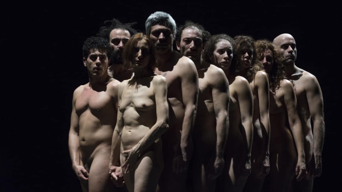 Emma Dante che partendo dai “Giganti della Montagna” dramma incompiuto di Luigi Pirandello (un gruppo di disadattati si rifugia in una chiesa dove una compagnia di attori sta provando) trova un modo personalissimo ed evolutivo di raccontare il mestiere dell’attore , e la tragedia dell’umanità. Uno spettacolo privo di tutto, senza scenografia, senza costumi, senza musica. Solo corpi nudi, 14 per l’esattezza, e una regia. Una regia millimetrica, incredibilmente precisa. Un demiurgo che sposta, scompone, ricompatta e raggruppa. Gesti come parole, mugugni come grandi discorsi. Emma con il suo pensiero e la meravigliosa bravura degli attori, che instancabili con i loro corpi ci raccontano la Storia, riesce ad incollare alle poltrone per ben 75 minuti gli spettatori. Lo spettacolo è tutto da vedere, non può essere raccontato, ogni singolo movimento è un paragrafo, ogni espressione è un capitolo. La nudità degli attori non è ambigua, è come la nudità dei bambini, naturale, quindi non scandalosa. L’unica voce dal fuori è la canzone “Only you” dei Platters