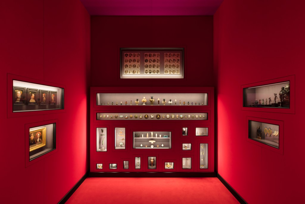 La mostra “Il sarcofago di Spitzmaus e altri tesori”, curata dal regista Wes Anderson e dalla scrittrice e illustratrice Juman Malouf nella sede milanese di Fondazione Prada in collaborazione con il Kunsthistorisches Museum di Vienna, è un gioco di libere associazioni, un esercizio di collegamenti dai più arditi e di difficile comprensione, ai più semplici e immediati che raccolgono opere diverse intorno a un colore o un soggetto. Così, 537 opere d’arte e oggetti selezionati tra le collezioni del Kunsthistorisches Museum e dal Naturhistorisches Museum di Vienna, ridisegnano la linea temporale e la geografia della cultura materiale umana custodita nelle due istituzioni austriache. Le opere sono esposte a gruppi: dagli oggetti di colore verde ai ritratti di bambini, dalle miniature agli strumenti di misurazione del tempo.